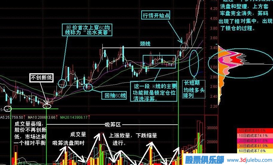 二、頸線的位置(狹義)。簡(jiǎn)而言之就是主力離開成本區(qū)的位置,在底部區(qū)域吸籌的個(gè)股可以認(rèn)為頸線之下就是主力成本區(qū)。