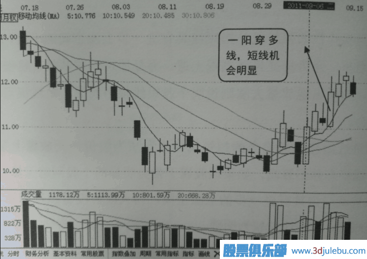 如圖2所示,該股在9月6日當(dāng)天出現(xiàn)放量一陽穿多線的特征,說明短線機(jī)會(huì)明顯,當(dāng)天尾盤可伺機(jī)跟進(jìn)。結(jié)果該股在9月6日之后股價(jià)進(jìn)一步上漲,且上漲幅度不小,如果跟進(jìn)短線收益理應(yīng)不菲。