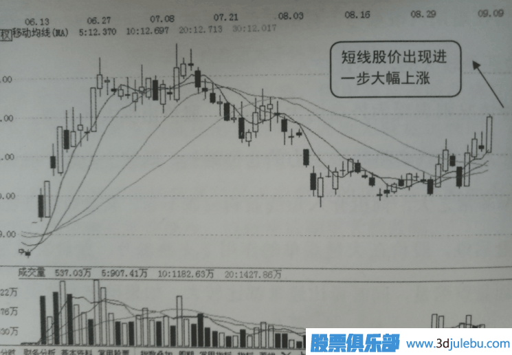 如圖2所示是該股接下來的K線走勢,圖中顯示該股當天之后出現(xiàn)大幅上漲,短線受益非??捎^,可見在發(fā)現(xiàn)該股受到大資金關(guān)注時伺機跟進是正確的。
