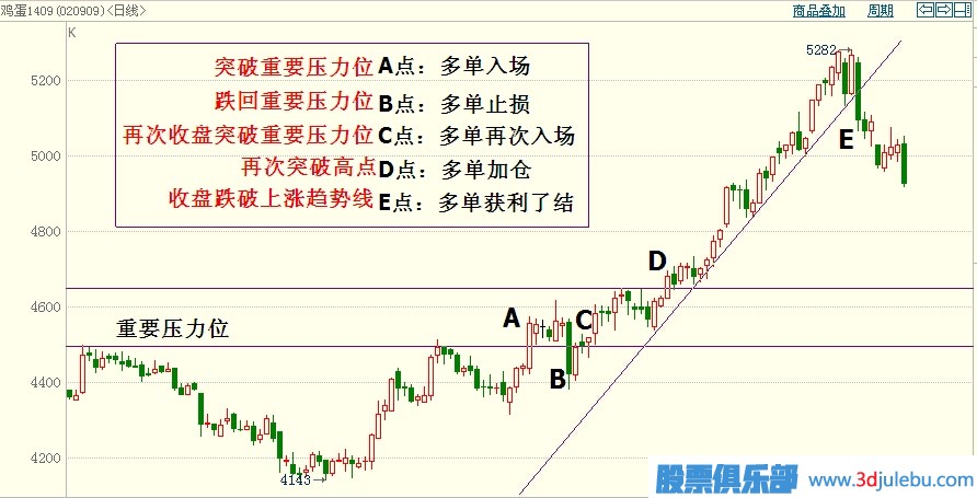 3、收盤跌破上漲趨勢線,多單獲利了結(jié)。