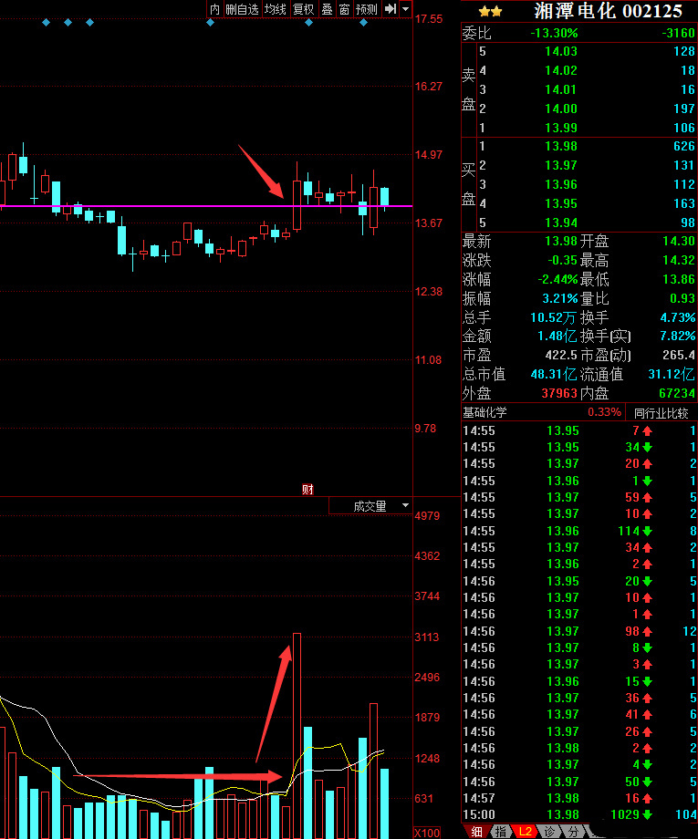 如果具備以上條件說明,大陽線的當天是主力的主要成本區(qū),而且在高位放量,證明主力成本較高。那么我們可以大概在集中放量的價位畫一個線,如示例圖的紫色線,這根線就是主力的成本線。一般操盤手不怎么喜歡自己賬面浮虧,所以一般會在收盤前把價位拉回去。