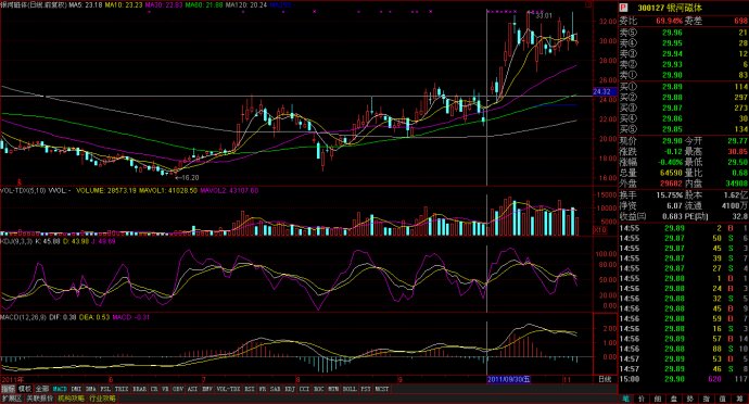 銀河磁體:十字線處出現(xiàn)了一根一字漲停線。前晚三季報出現(xiàn)了100%的增長。第二天順勢高開,并且高開在前一根波峰處,第三天接勢洗盤。第四天低開高走,封漲停。
