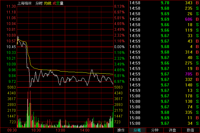 破位大陰線分時圖:開盤低開低走。然后全天保持箱型震蕩,收盤幾乎收在全天最低價。兩個細節(jié)引起注意:尾盤出現(xiàn)了一個大買單;最后一分鐘收盤價從17.9收到了17.99元。