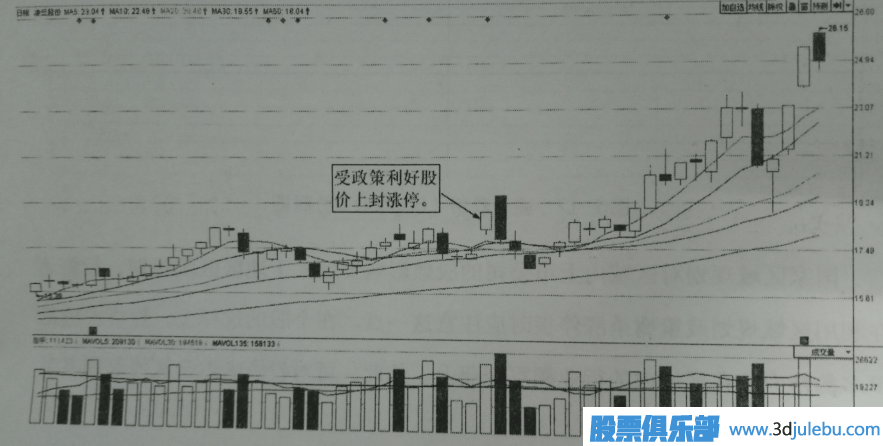 如圖1所示,在大龍地產(chǎn)(600159) 日K線圖中,該股股價(jià)前期一直處于小幅爬升的上漲趨勢(shì)中。消息面上,2015年4月30日,中央政治局會(huì)議審議通過的(京津冀協(xié)同發(fā)展規(guī)劃綱要》指出,推動(dòng)京津冀協(xié)同發(fā)展是一個(gè)重大國家戰(zhàn)略,核心是有序疏解北京非首都功能。公司作為當(dāng)?shù)胤康禺a(chǎn)上市公司,其股價(jià)受益政策利好出現(xiàn)漲停板。之后,其又走出了一波上漲行情。
