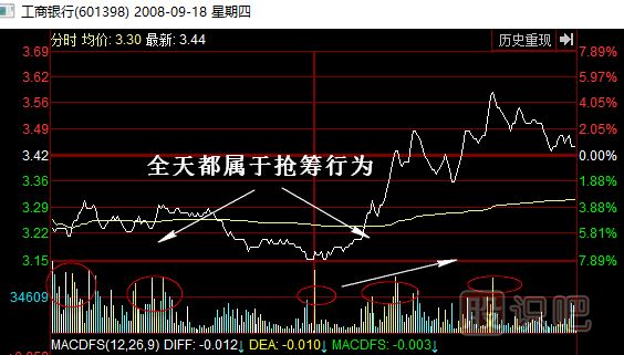 工商銀行(601398)2008年9月18日,拉出了大陽線,振幅達(dá)14%。匯金公司當(dāng)晚突然宣布增持,隨后股價(jià)連拉兩個(gè)漲停,短線漲幅30%以上。9月18日這個(gè)詭秘的大陽線回過頭來看,雖是先知先覺和獲知內(nèi)幕的主力涌進(jìn)的短線抄底盤,成交量大幅放大,出現(xiàn)奪命長陽時(shí)短線80%以上的概率會繼續(xù)大漲,但需要注意圖中30日生命線、60日決策線、120日趨勢線仍然大角度向下發(fā)散呈現(xiàn)空頭排列,這個(gè)底部只是短線底部,反彈早已注定了只是曇花一現(xiàn),大級別的歷史底部還沒到來。另外,還需要注意的就是當(dāng)日該股的分時(shí)圖,主力全天候都在搶籌,這也為后續(xù)幾日大漲,埋下了伏筆。